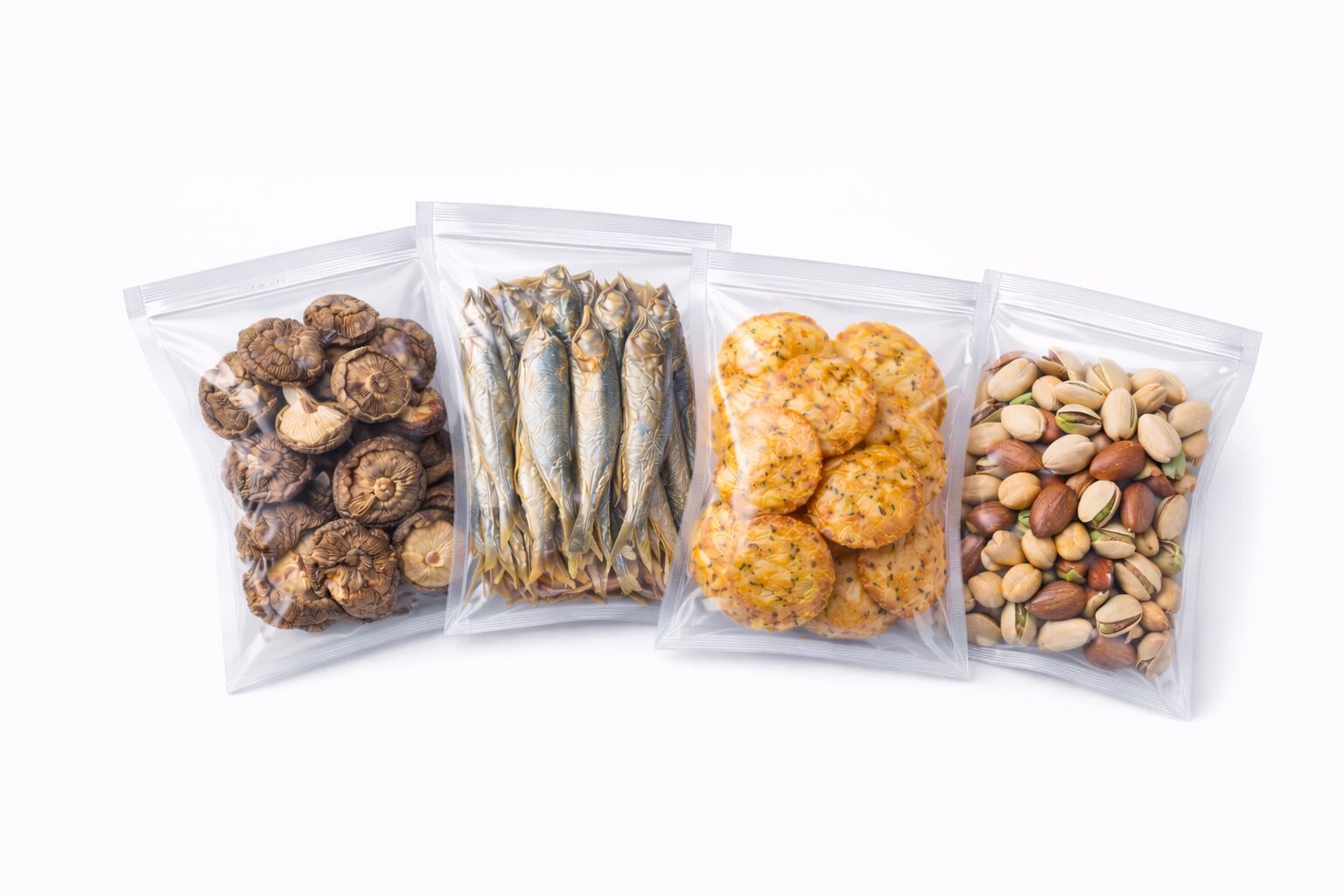 透明度が高く中身がきれいに見えるため、クッキー、ナッツ、ドライフルーツ、せんべいなどの食品包装や店頭販売用袋として幅広く使用されています。