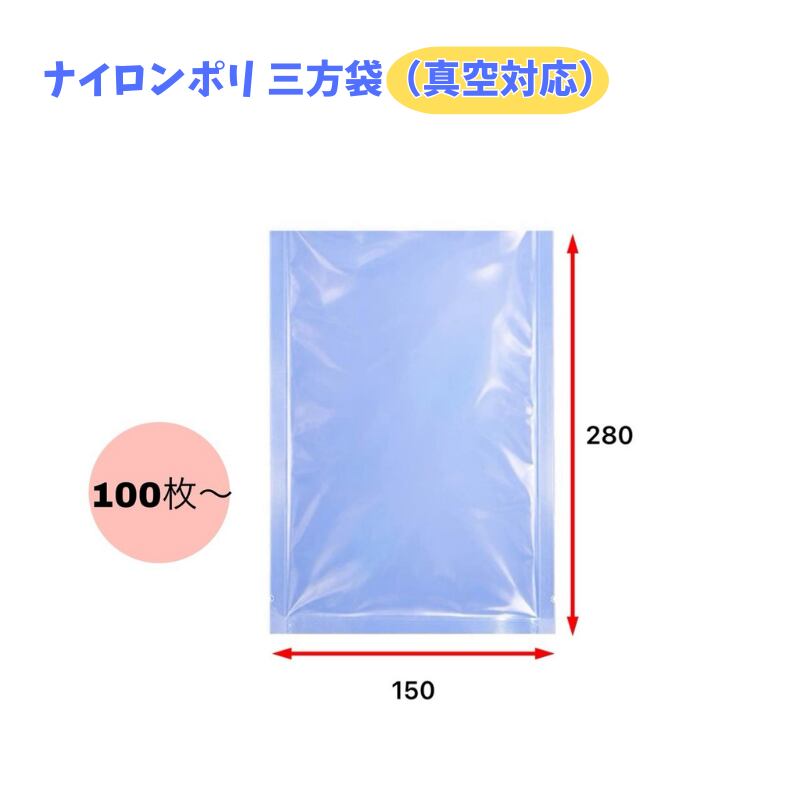 ナイロンポリ 三方袋(真空対応)食品用・業務用 透明 【150×280mm】 厚み0.075mm 無地 100枚/袋
