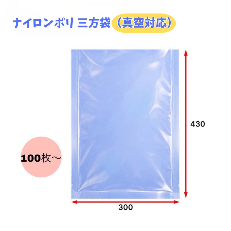 ナイロンポリ 三方袋(真空対応)食品用・業務用 透明 【300×430mm】 厚み0.075mm 無地 100枚/袋