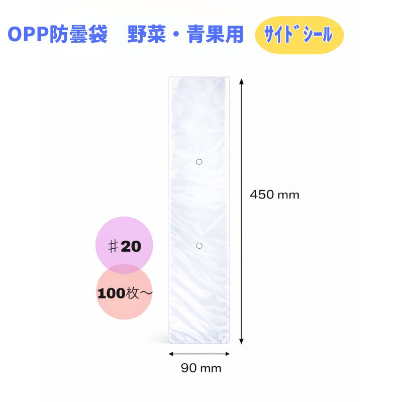 OPP防曇袋 野菜・青果用(業務用) 【90×450mm】 厚み0.02mm 2穴・プラ付 サイドシール 100枚/袋